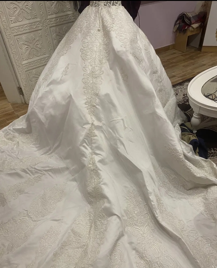 فستان عرس ابيض تفصيل ملبوس لبسة وحدة مع طرحة وتاج ولبسة تصوير للعروس