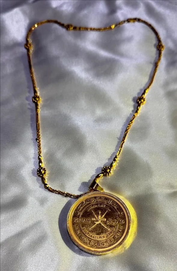 قلادة تذكارية ذهب عيار 22 بها ريال ذهب اصدار لذكرى العيد الوطني الخامس والعشرون عليه صورة السلطان قابوس الراحل طيب الله ثراه