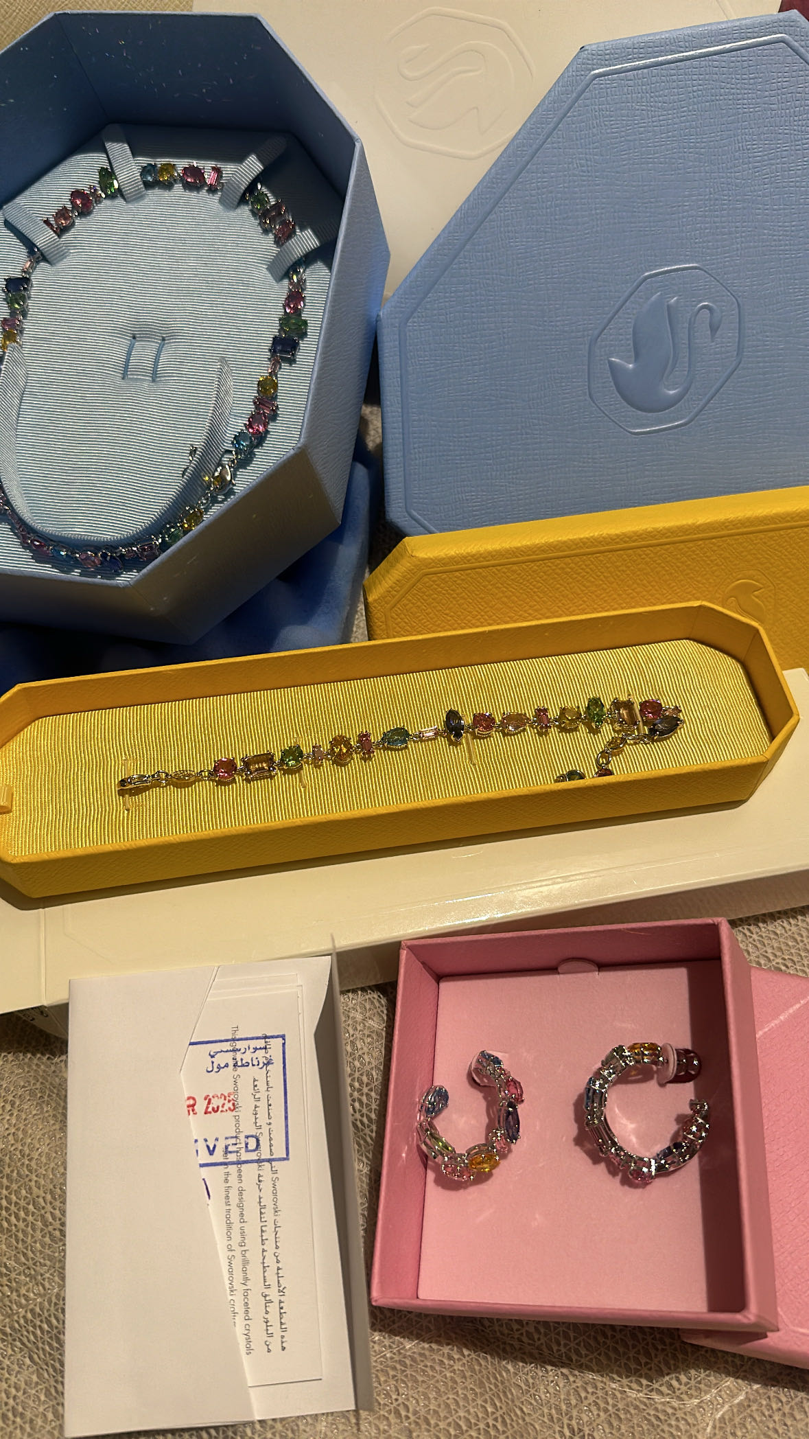طقم GEMA من سوارفسكي مكون من سلسال واسورة وحلق جديد مع الضمان والفاتورة لم يتم اخراجه من العلبه يجي معاه مرايه هديه من سوارفسكي سعر الشراء 4,465 سعر البيع 2,500