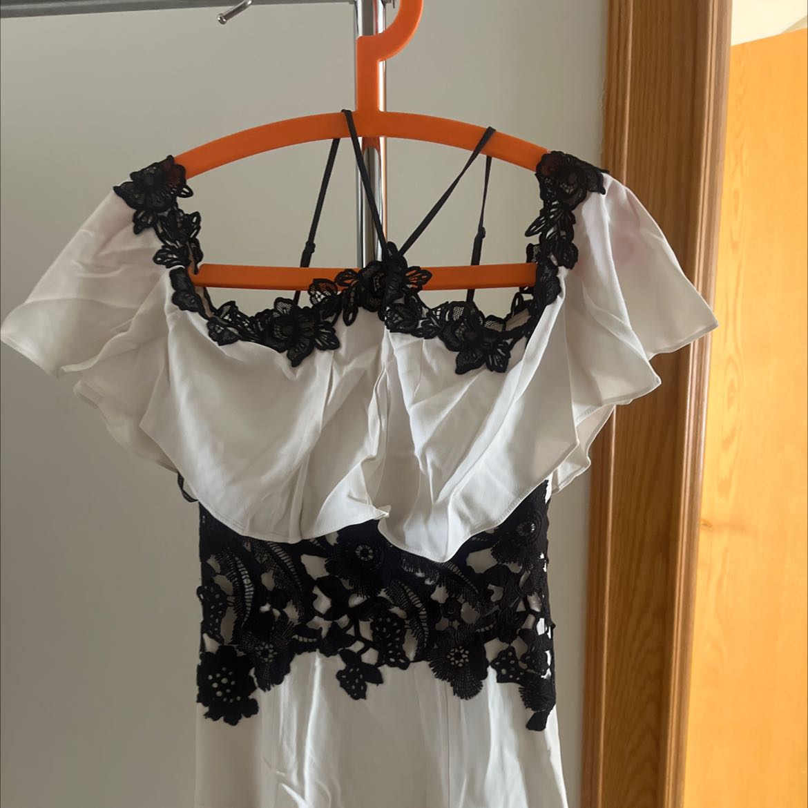 كارن ميلين فستان أنيق بالأبيض والأسود، تم ارتداؤه مرة واحدة فقط وبحالة ممتازة! تن الشراء من لندن تصميم أنثوي فاخر مع تطريز دانتيل فخم، مثالي للسهرات والمناسبات الخاصة. للمهتمات، تواصلوا معي.